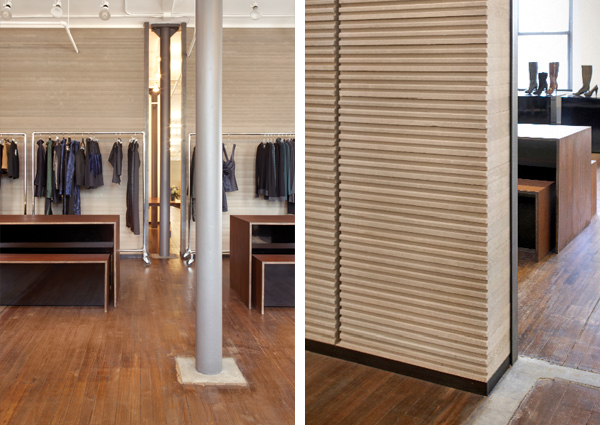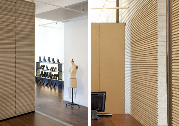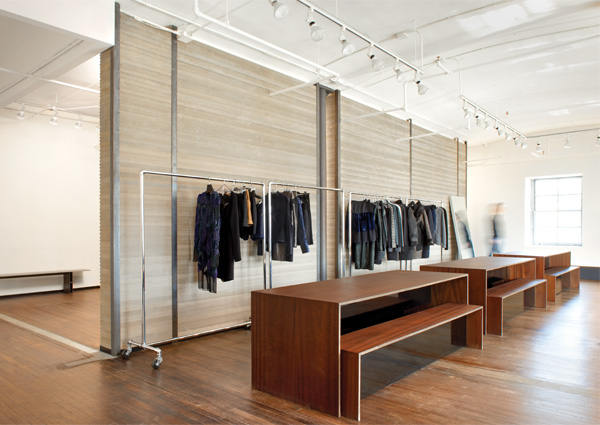 Inspired by the Proenza Schouler aesthetic and working within a modest budget, CDR Studio chose to use one material — homosote — as a wall material in order to provide a neutral background for the new space. Homosote was used to create walls with minimal "construction;" the material was stacked either horizontally or vertically to create different textural effects. The original vaulted ceiling spaces were cleaned and minimally constructed walls were then inserted. The main showroom walls were made of thick homosote roof decking stacked horizontally to create a dense, simple and textured background for the clothing. Full panels of the material were set vertically as screen elements, providing some privacy to the other areas of the program.
